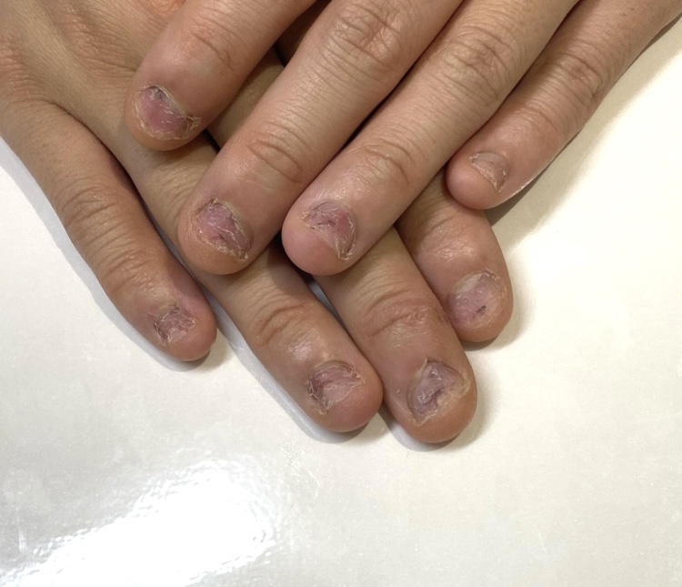 深爪の状態が長く続くと、慢性的な皮剥けに始まり、正常に生えることができなくなった爪は、異常角化や変形、刺激による色素沈着で変色・肥厚爪に発展することもあります。